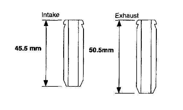 As length of the intake valve guide is different from that of the exhaust valve guide, be careful. (The lengths of guide for intake valve and exhaust valve are 45.5 mm and 50.5 mm respectively.)