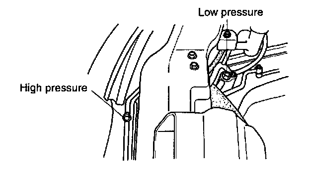 Connect a R-134a refrigerant Recovery/Recycling/Charging System to the high-pressure service port and the low-pressure service port, as shown, following the equipment manufacturer's instructions.