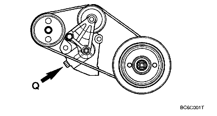 3. After installing the belt loosening the adjustment bolt counter clockwise at the "Q" arrow indication, apply tension to the belt by tightening the bolt clockwise.