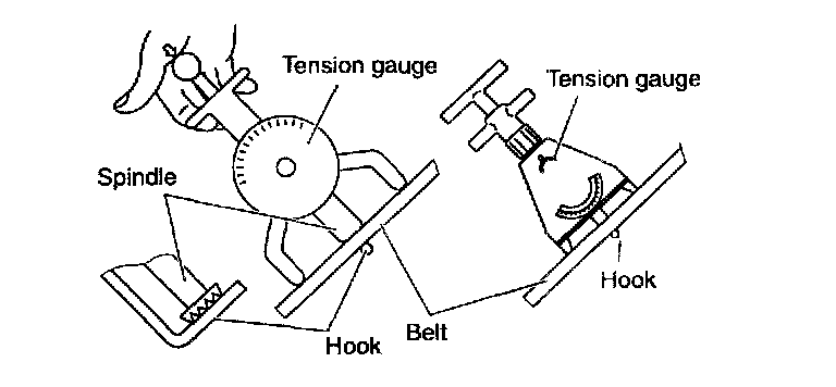 Insert the belt between spindle and hook holding the tension gauge by hand. Then release the tension gauge and read the value.