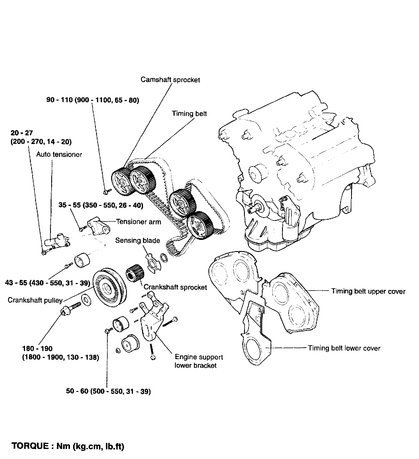 2. If any abnormal noise or difficulty in rotating the pulley by hand is noticed, replace the timing belt tensioner and idler pulley.