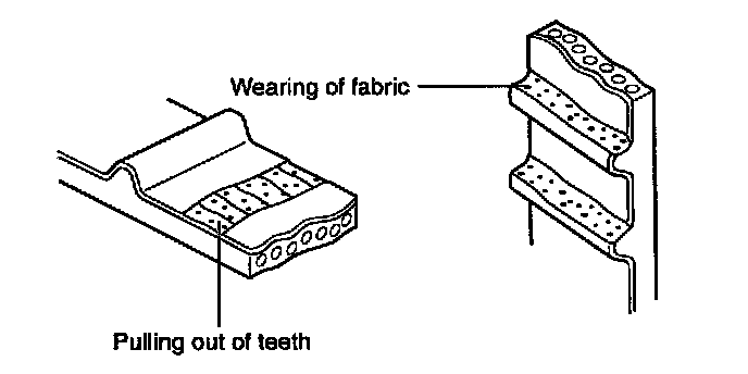 Fabric wearing of side face of load exerting tooth occurs and rubber is exposed (Length between teeth decrease.).