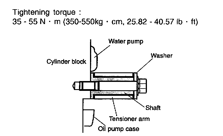 2. Install the tensioner arm, shaft and plain washer to the cylinder block.