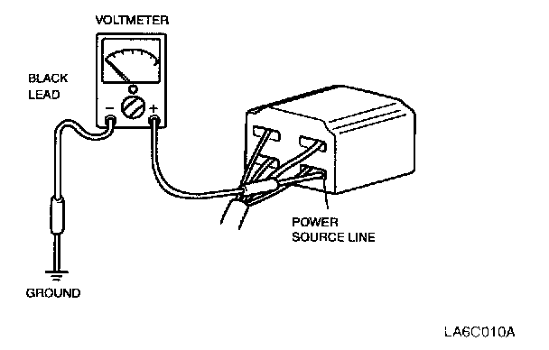 The DC voltmeter measures circuit voltage. A voltmeter with a range of 15 V or more is used by connecting the positive (+) probe (red lead wire) to the point where voltage is to be measured, and the negative (-) probe (black lead wire) to a body ground.