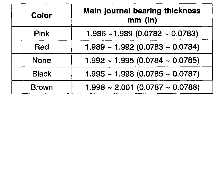 Main bearing oil clearance 0.018 - 0.036 mm (0.0071 - 0.0014 inch)MAIN JOURNAL BEARING THICKNESS (REFERENCE DATA)
