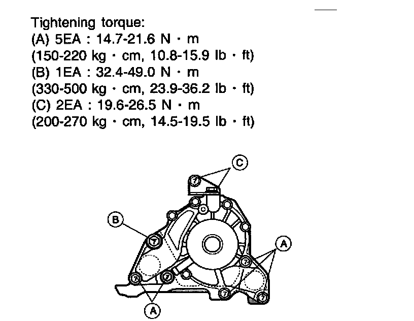 Engine coolant pump to cylinder block bolt head mark "7" bolt (M8x5EA) 15 - 22 Nm (150 - 220 kgf-cm, 11 - 16 ft. lbs.)Engine coolant pump to cylinder block bolt head mark "7" bolt (M10x1EA) 33 - 50 Nm (330 - 500 kgf-cm, 24 - 37 ft. lbs.)