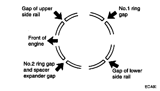 7. Position each piston ring end gap as far away from its neighboring gaps as possible. Make sure that the gaps are not positioned in the thrust and pin directions.