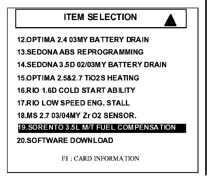 14. Select option 19. SORENTO "3.5L M/T FUEL COMPENSATION and press "ENTER".