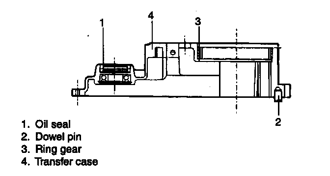 1. If ring gear was removed for replacement, align serrations on OD of new ring gear with those in transfer case. Press in ring gear, chamfered end first. Make sure gear is not cocked and is firmly seated in case.