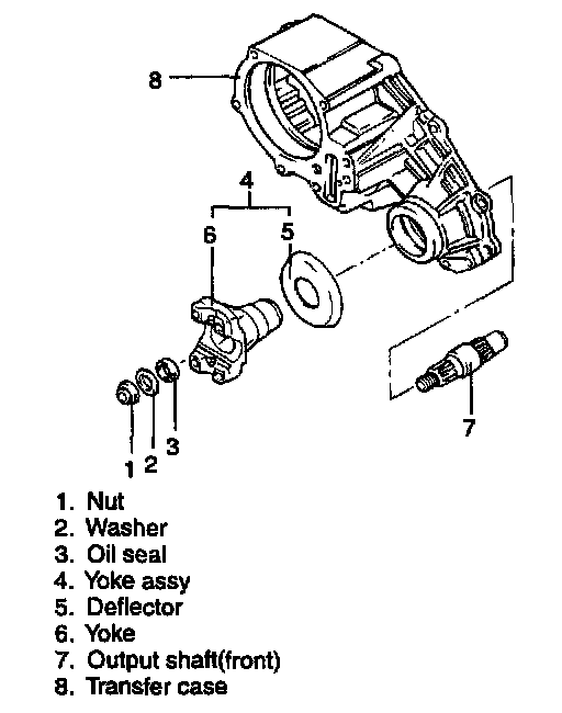 2. Position output shaft in transfer case and install yoke assembly, oil seal, washer and nut.