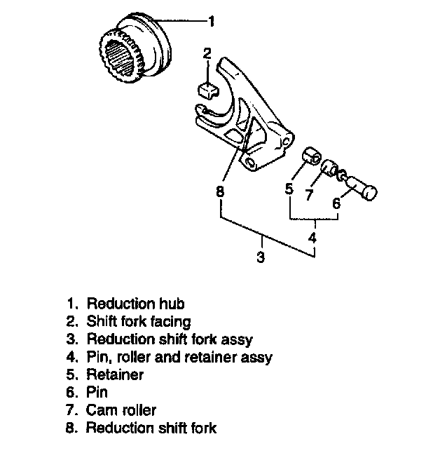 1. If disassembled for parts replacement, assemble reduction shift fork assembly using new pin, roller and retainer assembly. Press pin, roller and retainer assembly in to bore in reduction shift fork until retainer passes completely through and snaps in place. Make sure that cam roller turns freely.