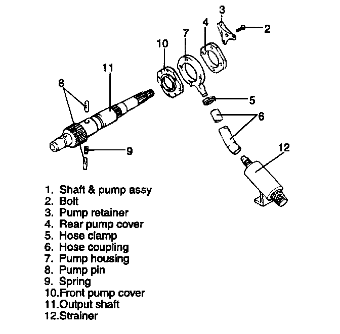 4. Install pump housing so that word REAR marked on it is up and hose bard points toward hose coupling and strainer. Lower pump housing over upper output shaft, moving pump pins inward and compressing spring so that both pins are contained inside pump housing.