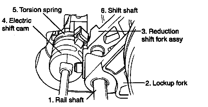1) Position electric shift cam group rotated so that end of torsion spring will contact side of reduction shift fork assembly that faces up, toward top of case.