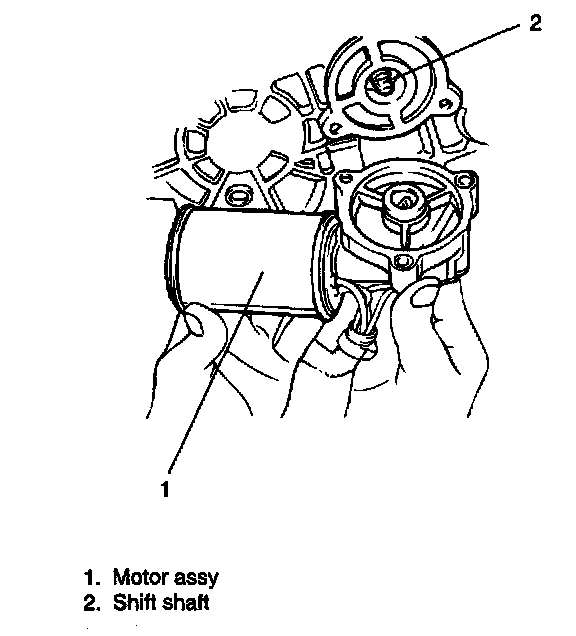1. Position motor assembly so that triangular slot in motor will align with shift shaft. Move motor in to engage shift shaft and contact cover. Then rotate motor in clockwise direction until motor is in correct position and mounting holes are aligned.