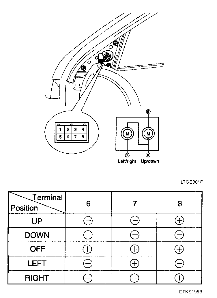 2. Apply battery voltage to each terminal as shown in the table and verify that the mirror operates properly.