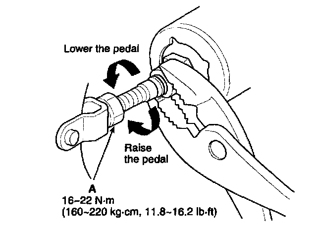3. Adjust the brake pedal height by turning the operating rod with pliers (with the operating rod lock nut loosened), until the correct brake pedal height is obtained.