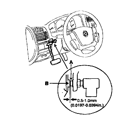 4. After turning the stop lamp switch(A) until it contacts the brake pedal stopper(B) (just before the brake pedal is caused to move), return the stop lamp switch 1/2 to 1 turn and secure by tightening the lock nut.