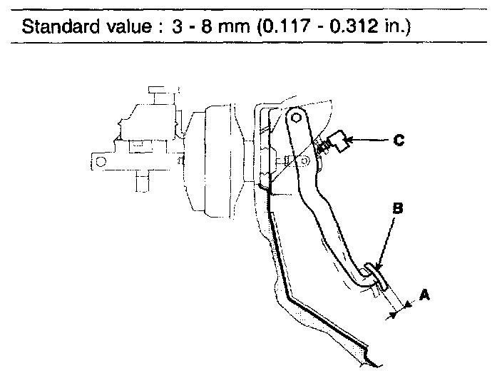 1. With the engine stopped, depress the brake pedal two or three times. After eliminating the vacuum in the power brake booster, press the pedal down by hand, and confirm that the amount of movement before resistance is met (the free play) is within the standard value.