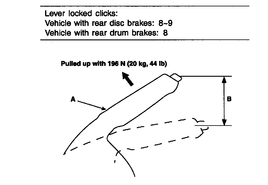 1. Pull the parking brake lever (A) with 196 N (20 kg, 44 lbs.) force to fully apply the parking brake. The parking brake lever should be locked within the specified number of clicks (B).
