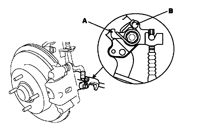 2. Make sure the parking brake arm (A) on the rear brake caliper contacts the brake caliper pin (B).