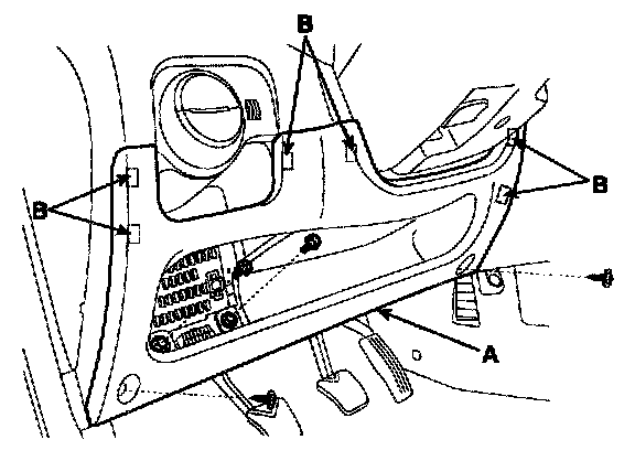 2. Remove the crash pad lower panel (A). Take care of fixing clips (B).