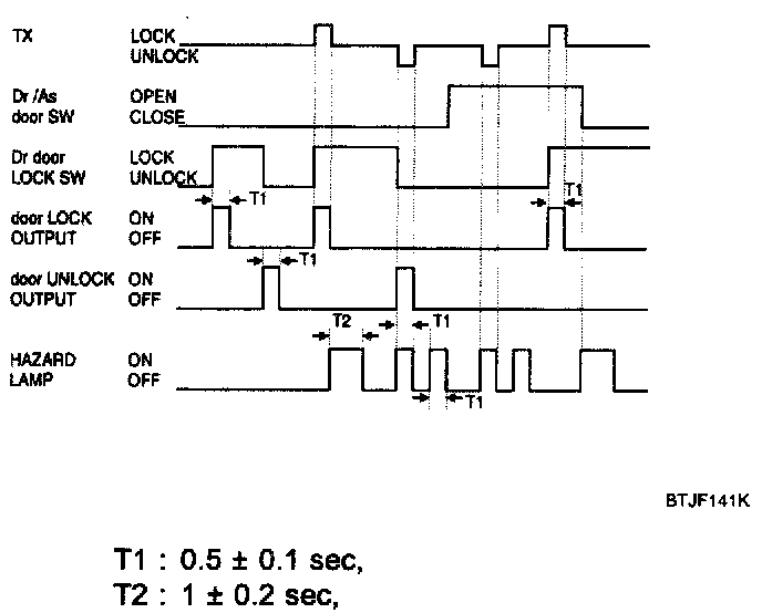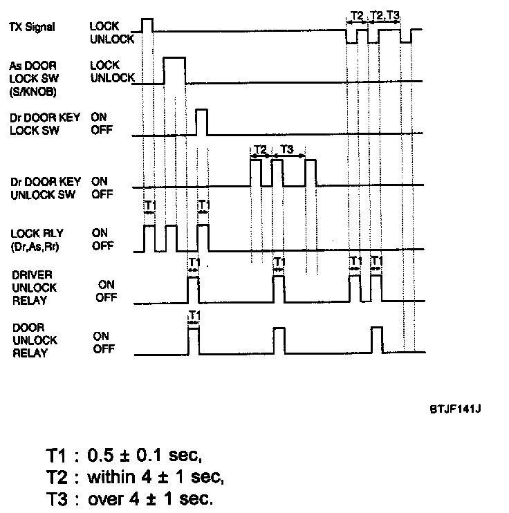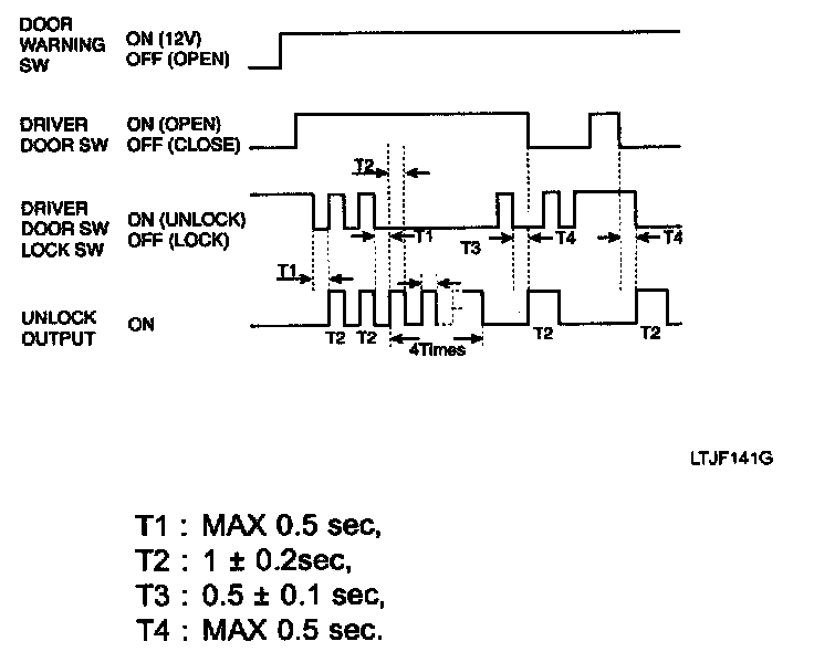 4. If drive or assist door lock switch is turned to lock from unlock after unlock output, the unlock output shall be On for T3.