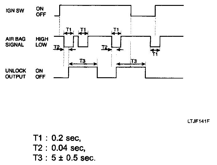 1. Whenever the air bag (below A/BAG) signal is inputted in the IG SW ON state, the unlock output shall be ON for T3.