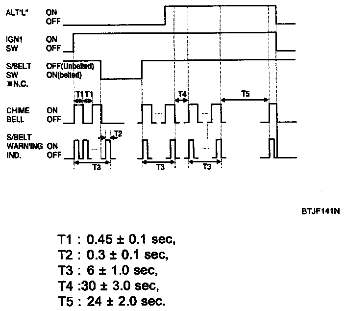 4. If unfastened S/Belt state continues after 60 sec-TIME COUNT from ALT"L" ON, the Warning Lamp flashes and Warning Bell sounds 11 times in 30 sec-cycle (6 sec ON/ 24 sec OFF) after 30 sec from ALT"L" ON.
