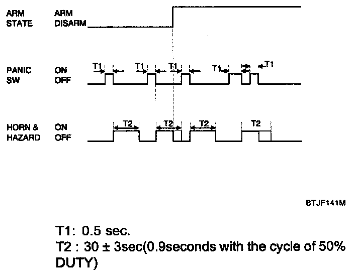 3. In the state that the Key is OUT (KEY IN SW=OFF), the Dr/As/RR door switch are close, if there is no change during 30 seconds after the TX Unlock is output, then the Hazard lamp output shall be ON for T2 at one time after the Lock is output for T1.