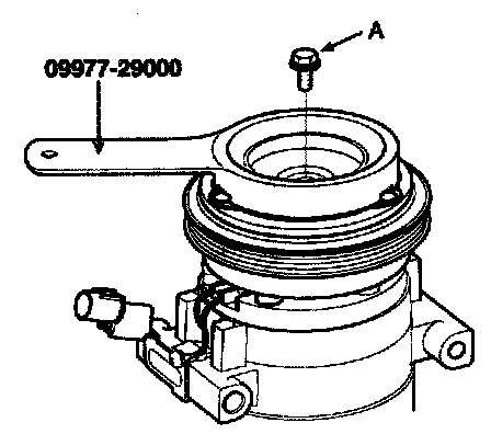 1. Remove the center bolt (A) while holding the disc & hub assembly with a commercially available disc & hub assembly bolt remover; Special tool number 09977-29000.
