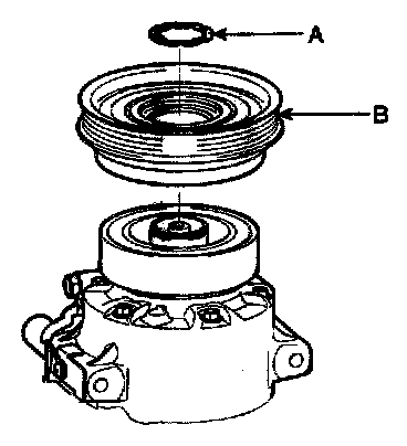 - Be careful not to damage the pulley (B) and compressor during removal/installation.