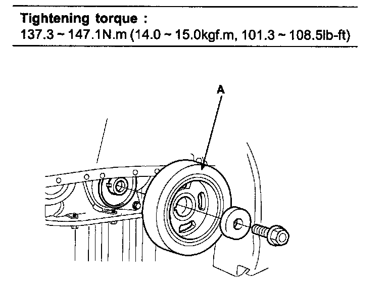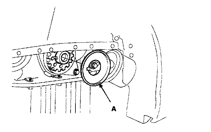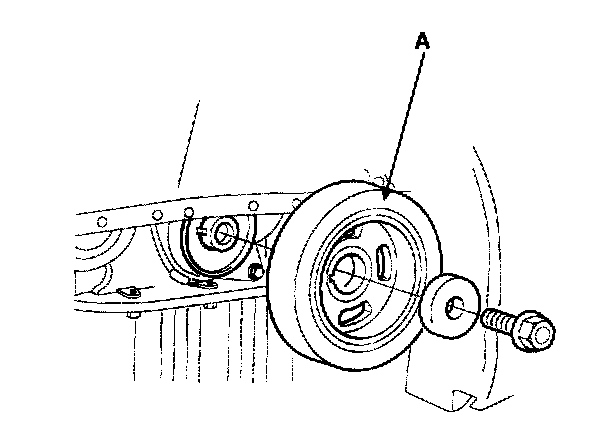 11. Install the flange and crankshaft pulley(A), and then tighten crankshaft pulley bolt.