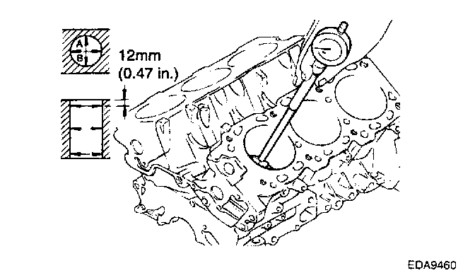 2. Measure the cylinder bore with a cylinder gauge at the three levels indicated, in the directions A and B.