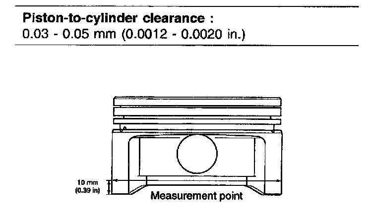 Piston-to-cylinder clearance: 0.03 - 0.05 mm (0.0012 - 0.0020 inch)