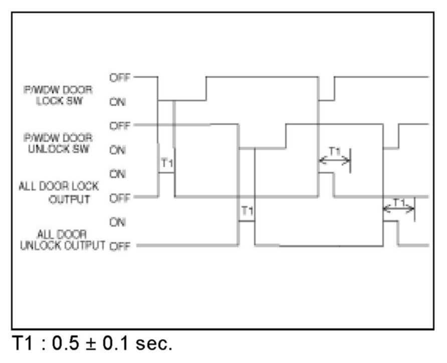 1. When using the power window main door switch LOCK/ UNLOCK ON, all doors will LOCK/ UNLOCK within a maximum period of 0.5 seconds. (Provided that if main switch LOCK is OFF within 0.5 seconds, relay output is OFF right after.)