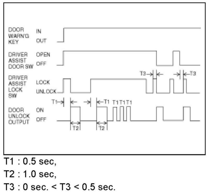 9. After Step 7), the use of an assist door switch a second time after 3.0 seconds will not cause UNLOCK to activate.
