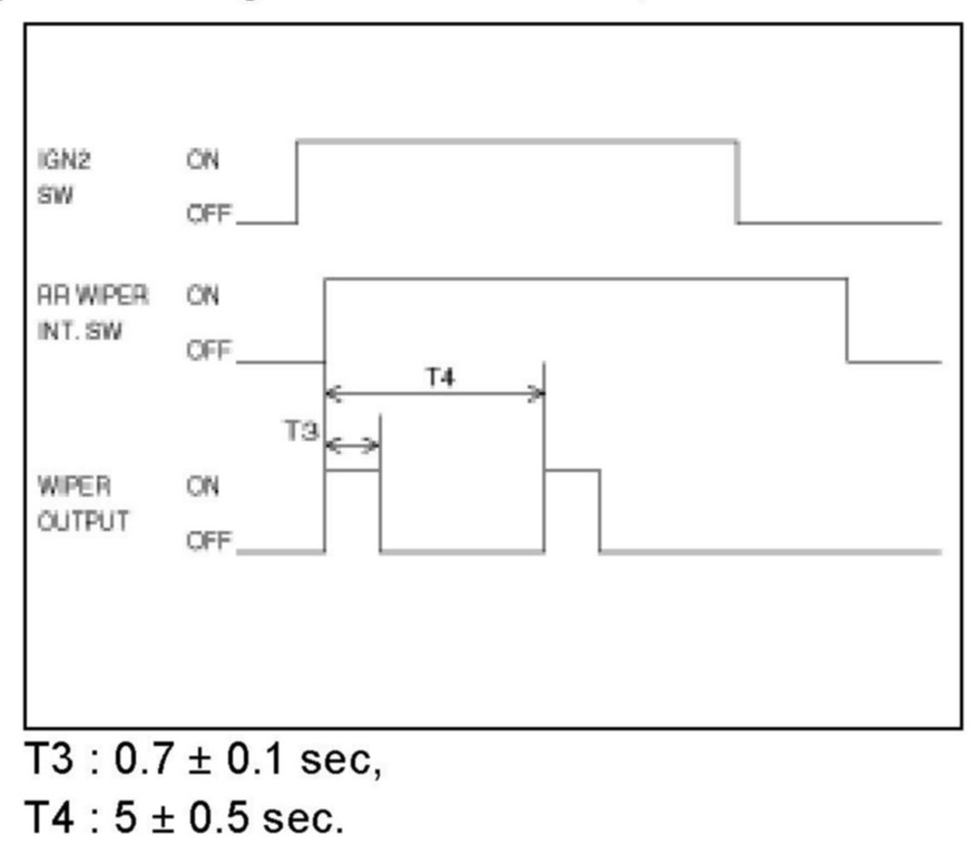 4. When the ignition switch is ON, if the intermittent rear wiper switch is turned ON, rear wiper output will remain ON for up to 0.7 sec. (T3).