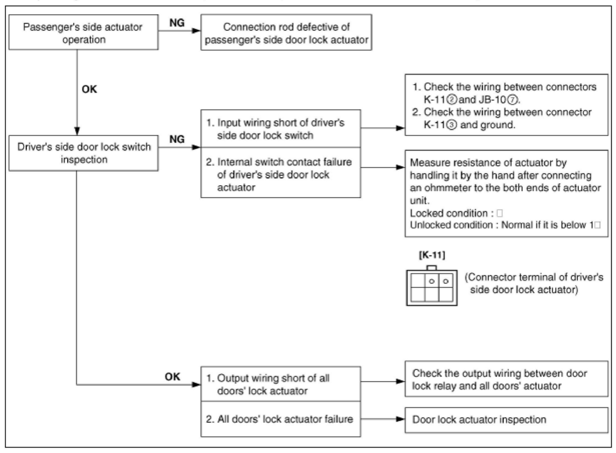 1. Lock function works but unlock function does not work. -> Since door unlock relay is fail, replace the door unlock relay.