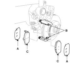 3. Install the brake pads (B) and pad shims (A) correctly. Install the pad with the wear indicator (C) on the inside.