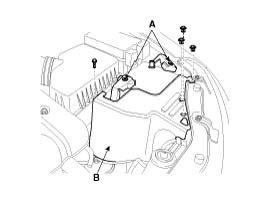 1. Disconnect the terminals (A) from battery and remove the heat shield (B).