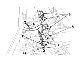 10) Disconnect the ground cables (D, E) from the intake manifold and vehicle's body.