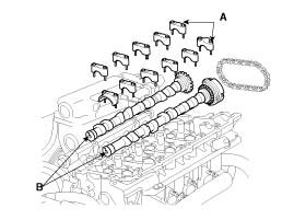 23. Remove the camshaft bearing caps (A) and camshafts (B).