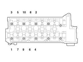 1) Using 8 mm and 10 mm hexagon wrench, uniformly loosen and remove the 10 cylinder head bolts, in several passes, in the sequence shown.