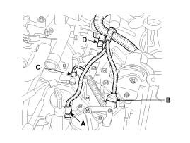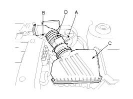 2) Disconnect the breather hose (B) from intake air hose (D).