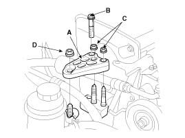 31. Remove the bolt (B), nuts (C, D) and engine mounting support bracket (A).