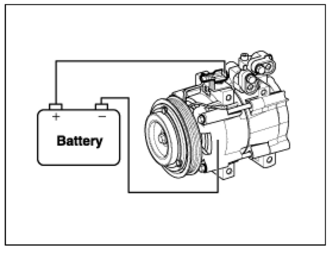 Connect the compressor terminal to battery (+) and the battery (-) terminal to the compressor body. Verify magnetic clutch operation by a clicking noise.