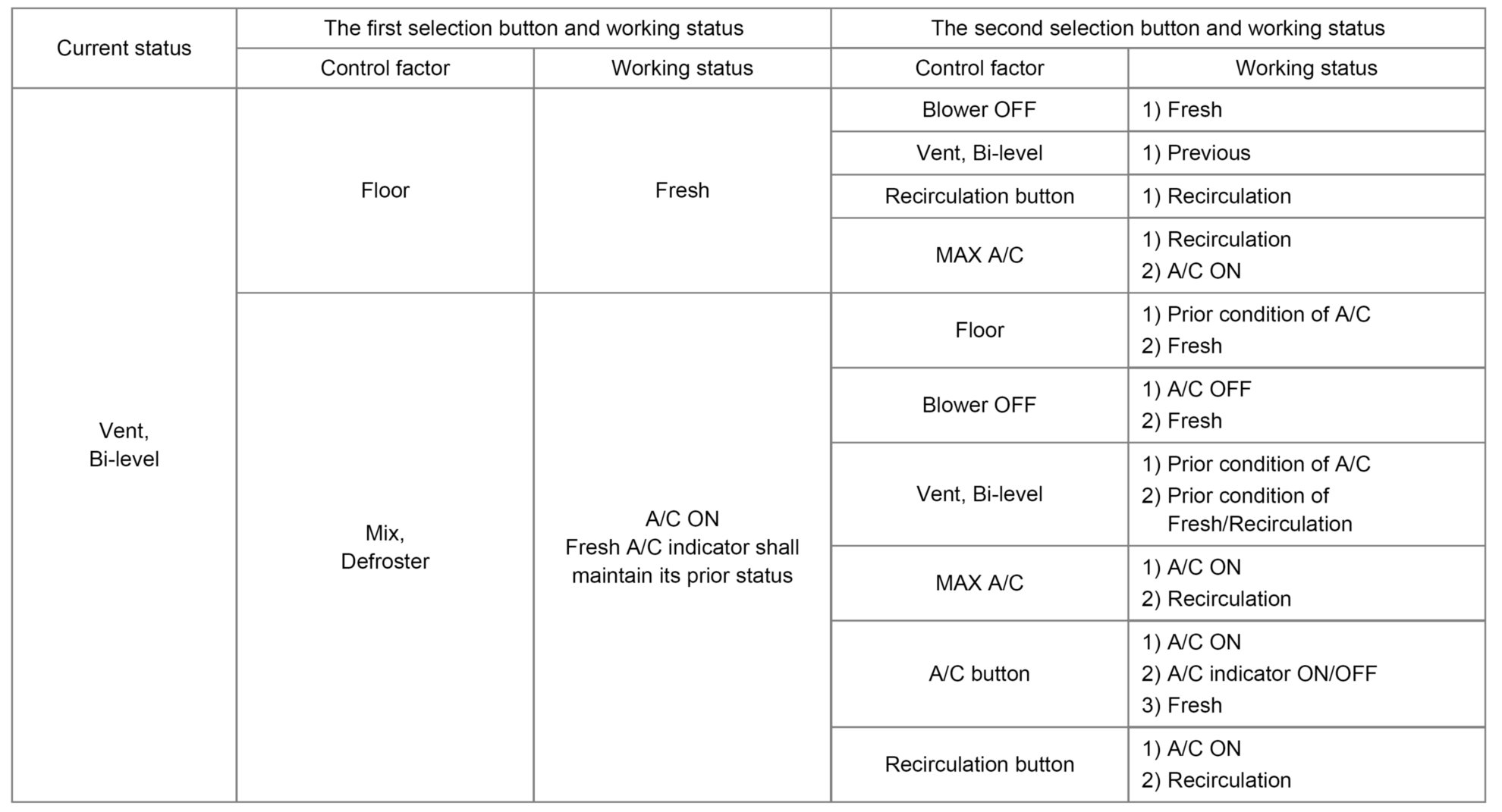 1. when defroster or mix selected, A/C ON, A/C select and A/C output signal are ON, the A/C indicator shall maintain its prior status, working in the fresh mode to help defrost.
