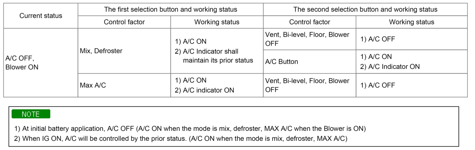 2. when IG ON, A/C will be controlled by the prior status. (A/C ON when the mode is mix, defroster, MAX A/C)
