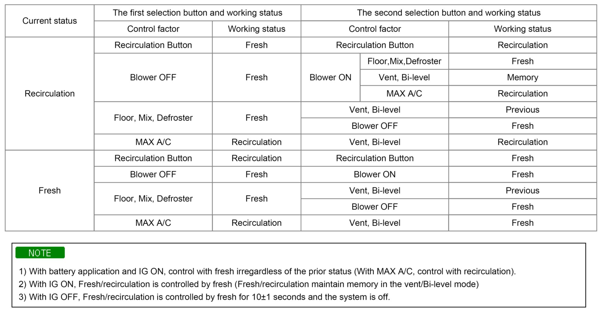 2. with IG ON, Fresh/recirculation is controlled by fresh (Fresh/recirculation maintain memory in the vent/Bi-level mode)