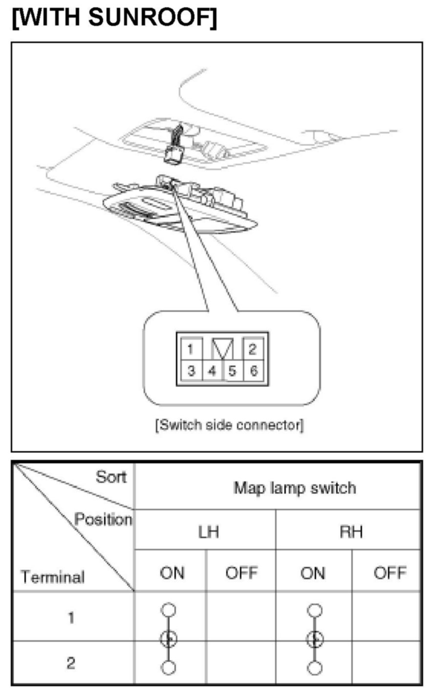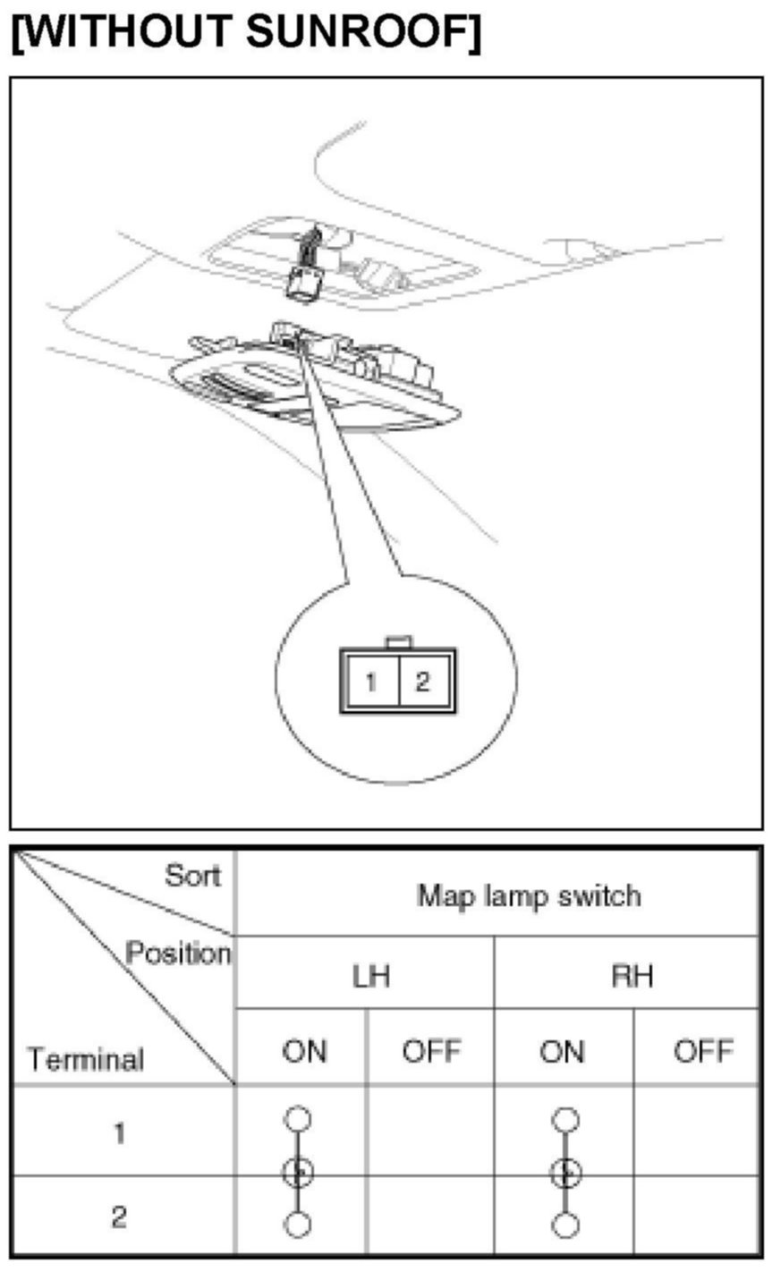 Remove the overhead console lamp assembly then check for continuity between terminals.